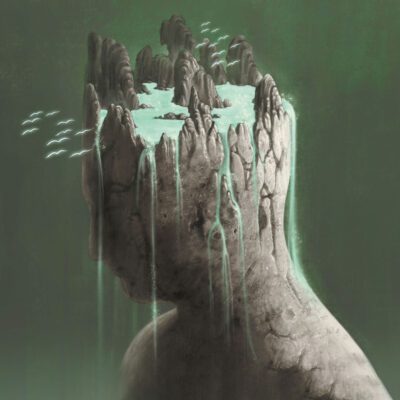 Freedom concept The sea and waterfall on broken human sculpture,